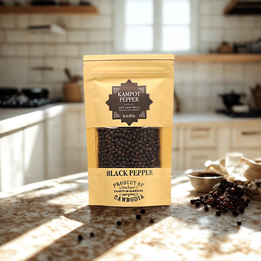 Ten czarny pieprz nadaje się do wszelkiego rodzaju potraw, a szczególnie dobrze komponuje się z grillowanymi rybami i czerwonymi mięsami. Specyfika pieprzu kampot wynika z łagodności przypraw, świeżości i złożoności aromatu oraz wyjątkowej trwałości.